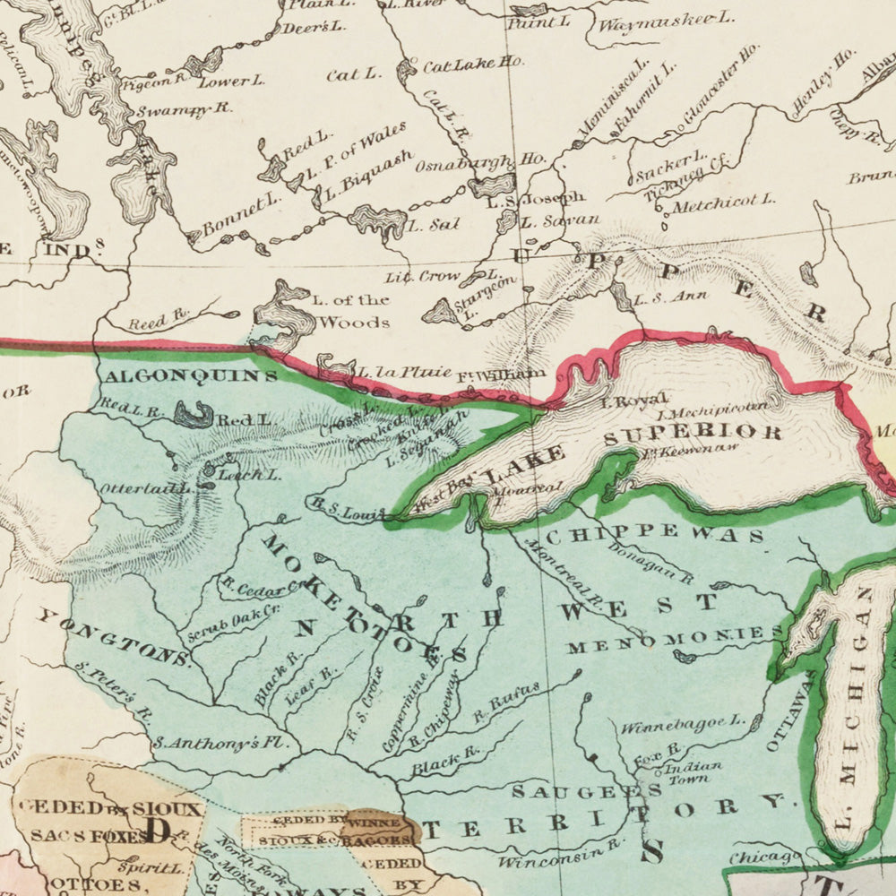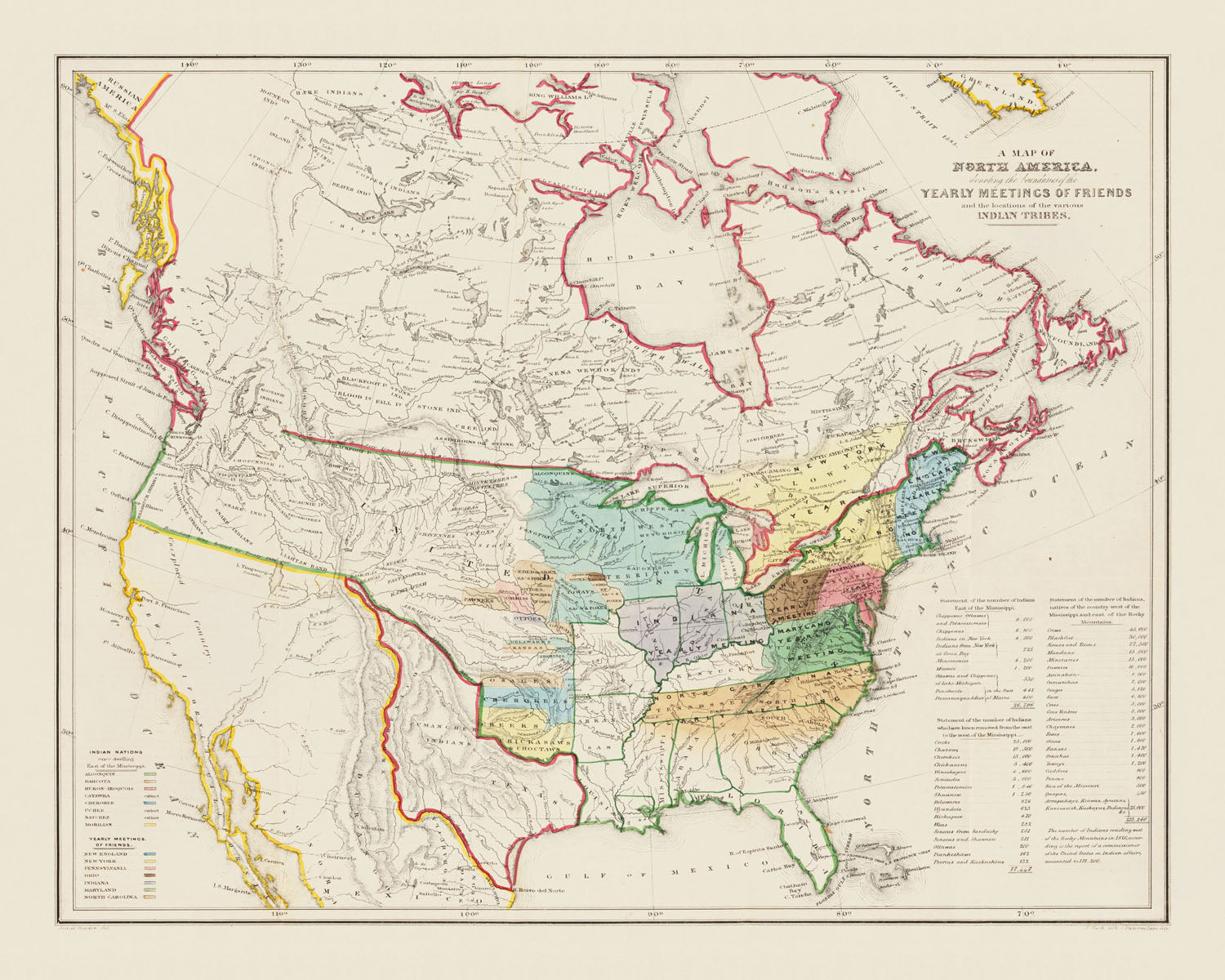 Bowden, a committed English Friend, devised a map that reflects the practical, documentary temper of Quaker reform. The Meeting for Sufferings—the London Yearly Meeting’s standing committee—tasked its Aborigines’ Committee with gathering evidence and raising awareness of injustices facing Indigenous peoples. Bowden’s solution is cartographic synthesis: a “moral topography” that overlays ecclesiastical administration and human displacement. The calibrated tints delineating Yearly Meetings speak to Quaker organization and pastoral reach, while the precise labeling of tribal territories supplies a sobering ledger of consequence. Issued in London, the sheet let transatlantic readers situate reports from the field—letters, minutes, and itinerant journals—against the hard facts of mountains crossed, rivers forded, and frontiers pushed.