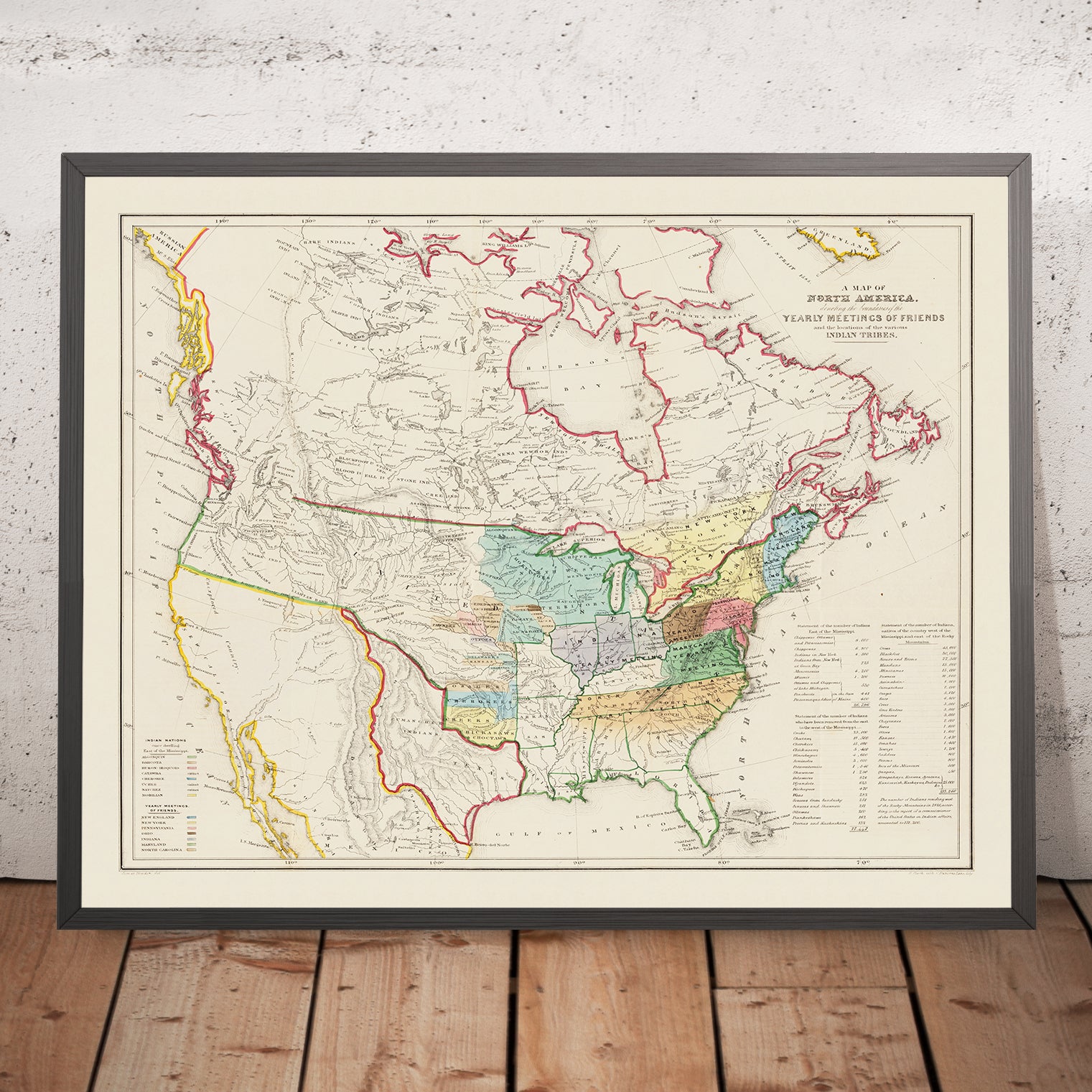 Old Rare Map of North American Indian Tribes, 1844: Quaker Meetings, Native Americans