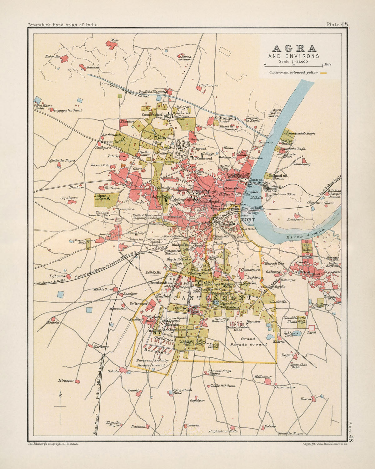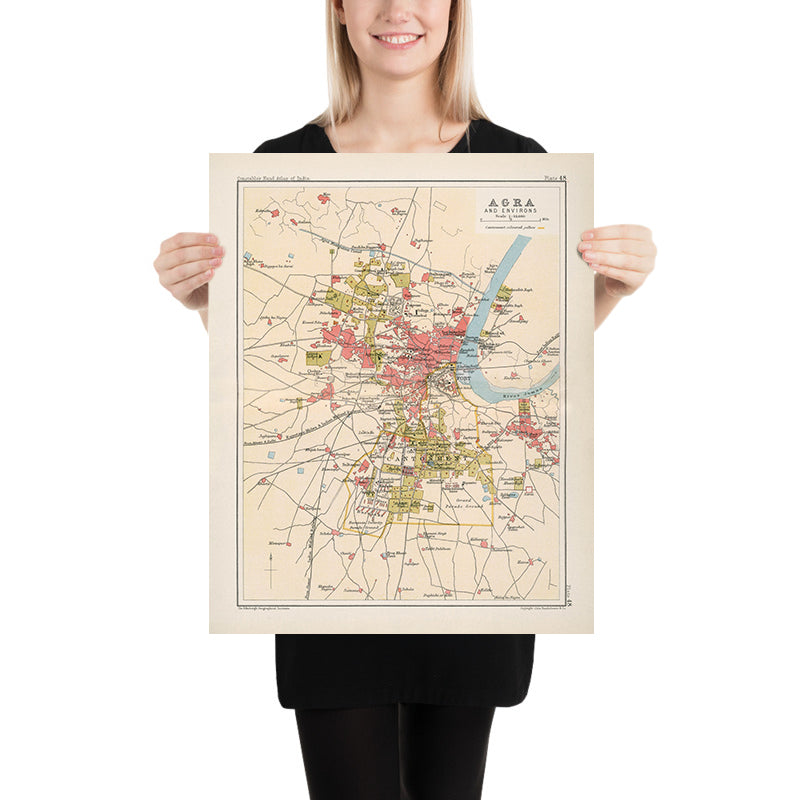 Agra and environs, issued in 1893 by the eminent cartographer J. G. Bartholomew and published by Archibald Constable & Company, presents the Mughal capital’s river-bent silhouette at a decisive moment of modern transformation. This richly colored city plan marries historical topography with the late–19th-century discipline of survey cartography: cantonment precincts glow in yellow, arterial roads are crisply articulated, and railways stitch Agra to the wider subcontinent. The map’s citymaking intelligence is immediate—Agra is read as both imperial showcase and strategic node, where the Yamuna’s curve frames fort, markets, gardens, stations, and bridges. As a city map, it is compelling because it captures the layered choreography of monument, bazaar, military space, and infrastructural ambition in a single, legible composition.