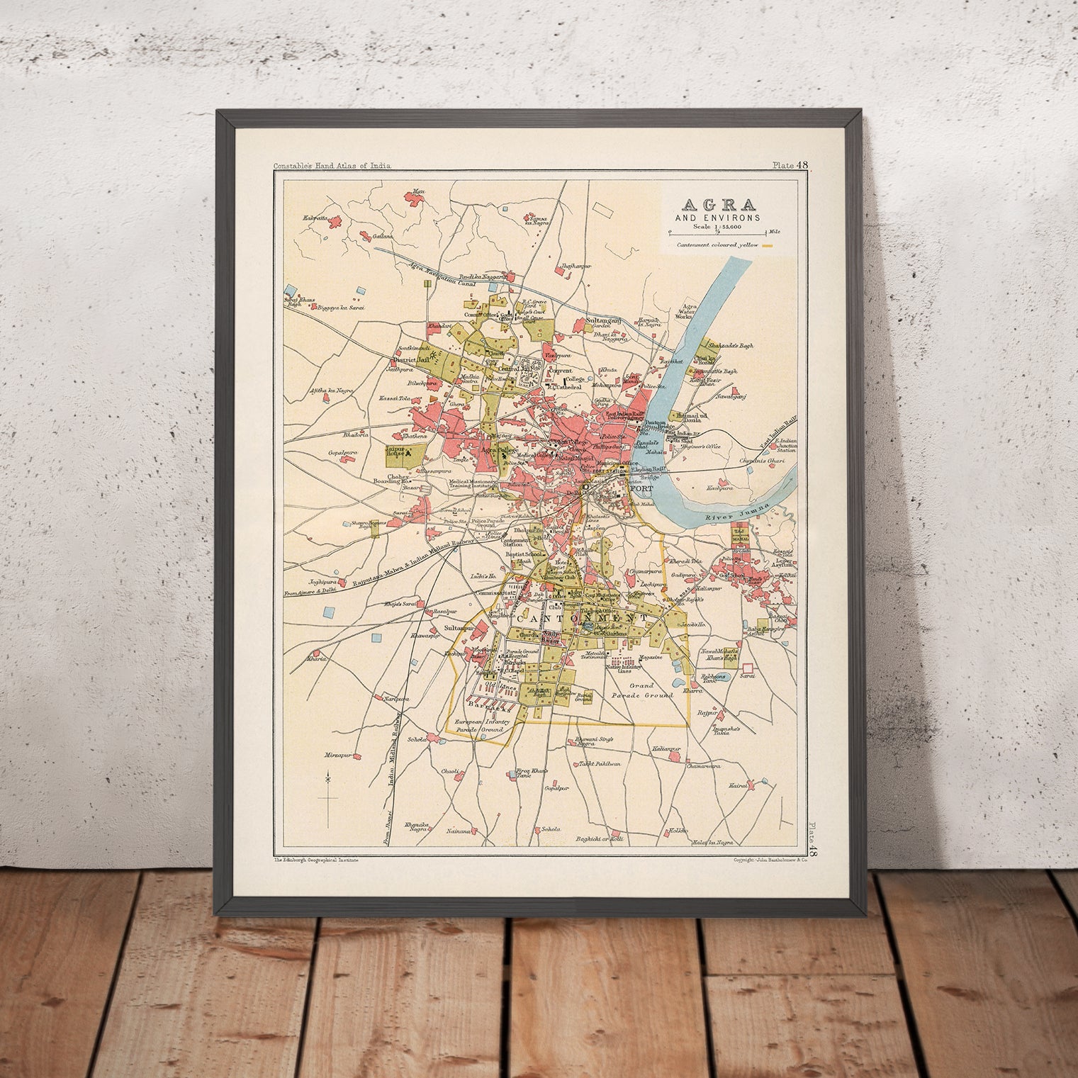 Bartholomew—founder of the Edinburgh Geographical Institute and a giant of 19th-century cartography—brings his hallmarks to Agra: disciplined typography, harmonious color, and an analytical eye for transportation, public buildings, and terrain. Under Constable’s imprint, his work balanced artistry with pragmatic intelligence, giving readers a city they could navigate as well as admire. This 1893 plan is historically resonant: it records a Mughal river city contoured by centuries of monument-building even as railways, cantonments, and administrative grids reshape its destiny. For collectors and historians alike, its strength as a city map lies in how precisely it names the arteries—Delhi, Jhansi, Gwalior, and beyond—and how elegantly it reveals the living dialogue between fort, bazaar, garden, garrison, and the patient, commanding Yamuna.