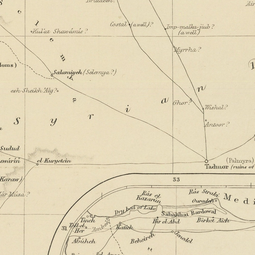 Politically, the sheet outlines the Ottoman provincial fabric—the pashaliks and districts that ordered authority from Aleppo to Damascus—rendering borders as both markers of governance and membranes of exchange. Drawn in the immediate wake of the Egyptian interlude in Syria, these lines capture a moment when diplomacy, reform, and geography met on paper. The Sinai inset enlarges that perspective, illuminating the land bridge that linked Nile and Levant and the pilgrimage, postal, and military corridors that animated it. The result is a work in which administrative intelligence and physical geography are inseparable—a vivid, learned snapshot of how mid-nineteenth-century Europe understood Syria’s terrain, cities, and frontiers at the crossroads of empire, faith, and trade.