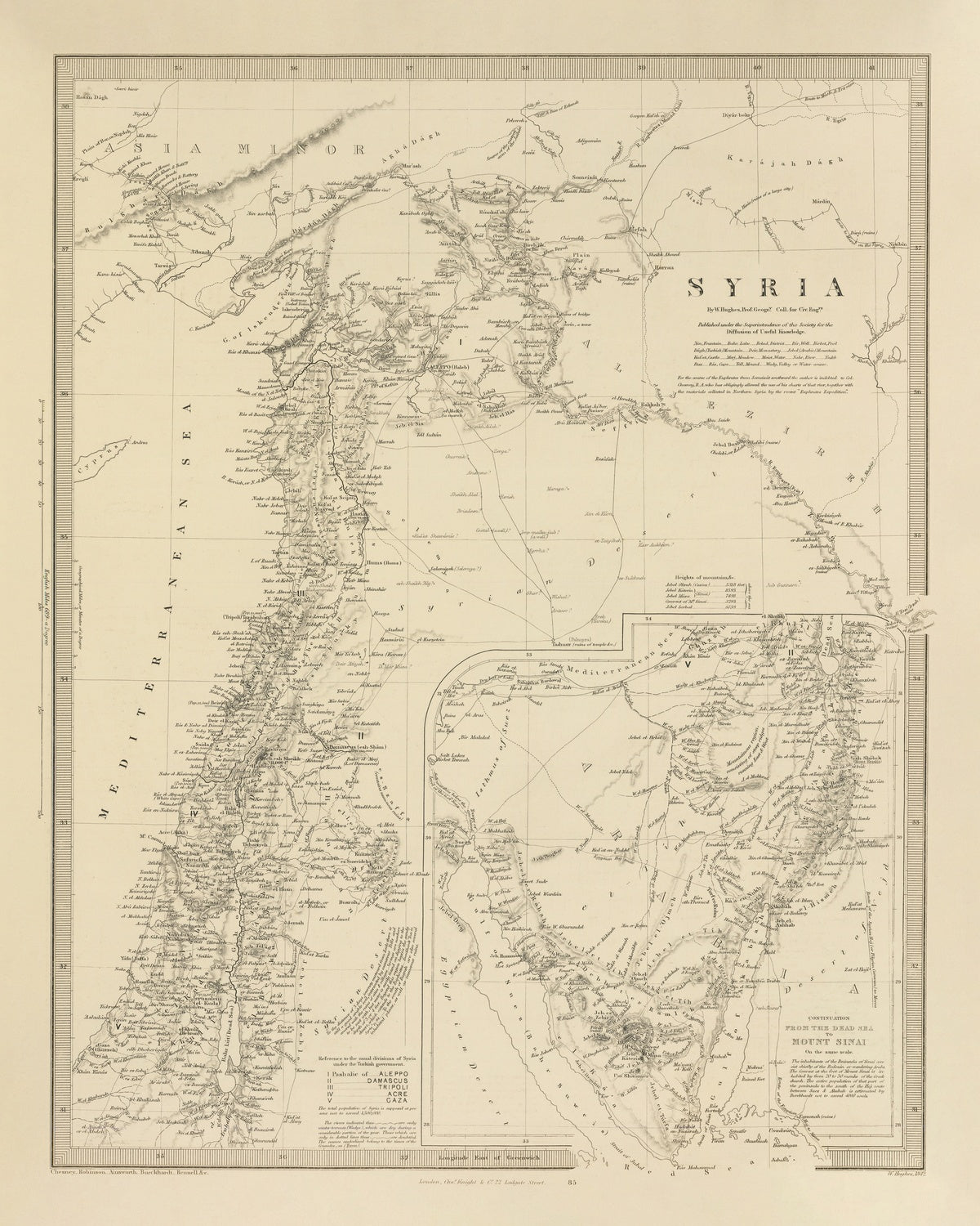 Entitled Syria, this 1843 map from the Society for the Diffusion of Useful Knowledge presents a lucid portrait of the Levant as understood in the early nineteenth century. It spans the Mediterranean littoral to the inland plateaus, encompassing territories that today include Lebanon, Jordan, and Israel, while centering the historical Syrian heartland. The composition balances terrain and polity: mountains are etched with disciplined hachures, the Jordan River is traced from its northern sources, and administrative demarcations are crisply drawn. Damascus and Aleppo anchor an articulate network of towns, and the coastal sequence from Latakia through Tripoli and Beirut to Haifa is cleanly paced. An inset of the Sinai Peninsula broadens the frame, underscoring the hinge between Egypt and the Levant.