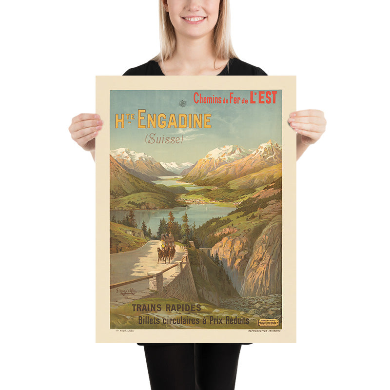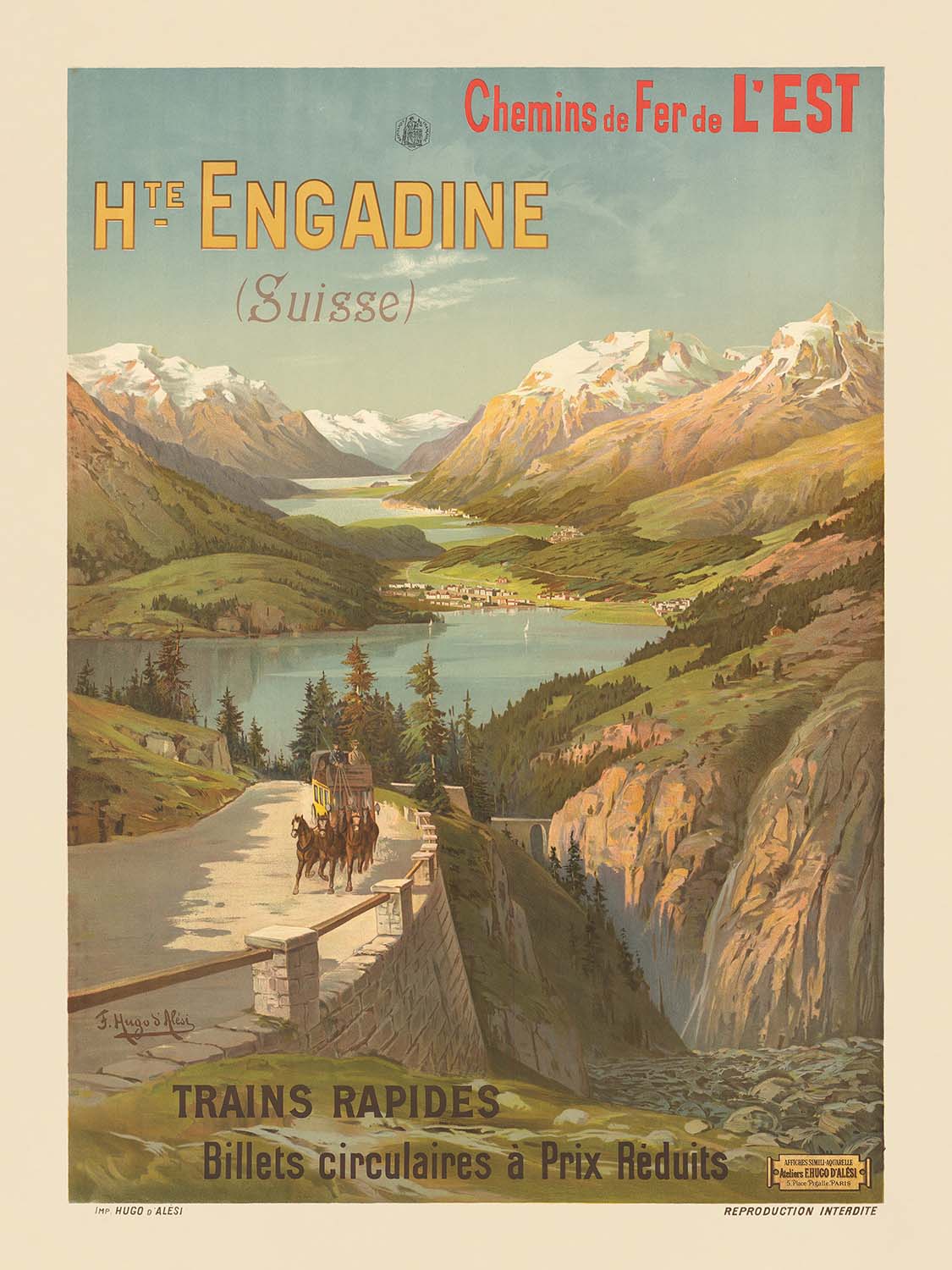 Chemins de fer de l’Est – Hte. Engadine – Trains rapides by F. Hugo d’Alesi invites the viewer on a Belle Époque journey from France to Switzerland’s Upper Engadine. Painted in the late 19th century, this classic railway poster captures the sweep of the high Alpine valley and its glacial lakes, setting them beneath snow-bright peaks. From a cliffside road in the foreground, a horse‑drawn carriage hugs a stone parapet while, to the right, a waterfall drops into a gorge—details that heighten the drama of arrival in the Engadine. Across the sky and above the panorama, the headline Hte Engadine (Suisse) appears in creamy yellow capitals with cool blue shadowing, while Chemins de Fer de l’EST crowns the sheet with the railway’s name in vivid red and blue.