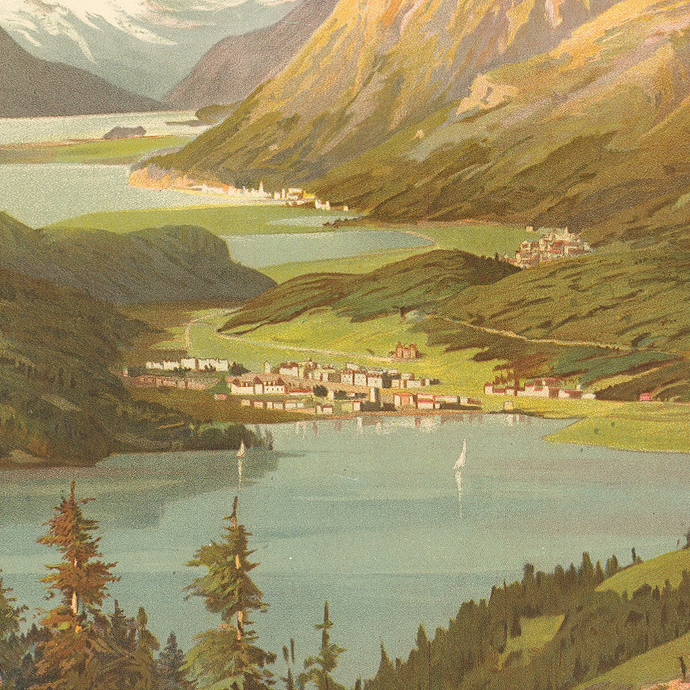 The subject here is the Upper Engadine, the high valley that includes resorts such as St. Moritz and a chain of lakes that gleam like linked mirrors. In the age of “trains rapides,” the French Eastern Railway promoted swift connections from Paris to this Swiss paradise, enticing travelers with circular tickets at reduced prices—exactly as the poster proclaims: TRAINS RAPIDES and Billets circulaires à Prix Réduits. The image distills the promise of Alpine leisure at a time when adventurous holidays and restorative mountain air were becoming hallmarks of European travel.