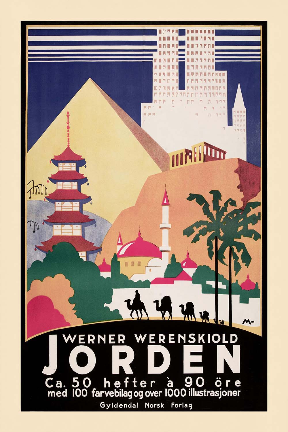 Jorden by Werner Werenskiold is a striking Art Deco travel poster that captures the spirit of early 20th‑century wanderlust. Designed to promote the publication “Jorden” (Norwegian for “The World”), the composition channels the optimism of the interwar years, when steamships, railways, and the dawn of commercial flight brought far‑flung destinations within reach. Stylized global landmarks—such as a tiered pagoda and desert pyramids—signal an invitation to explore cultures across continents, while bold, modern typography anchors the poster’s promotional purpose.
