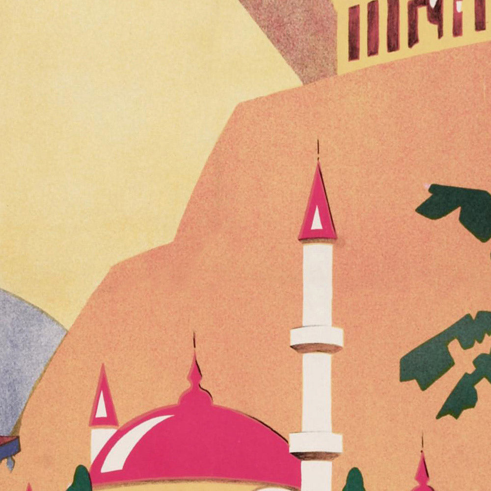 Design and color you’ll love: A radiant field of yellow sets the stage, energized by confident accents of red and grounded by verdant greens and deep blues. Clean, flat planes of color and sharply articulated shapes—angular spires, curving dunes, and tiered roofs—create rhythm and movement without clutter. The strong “JORDEN” masthead delivers graphic punch and balance, making the piece a focal point in a study, travel‑themed room, or contemporary living space. If you’re drawn to mid‑century interiors, modern minimalism, or the romance of world travel, this print offers a sophisticated, conversation‑starting statement.