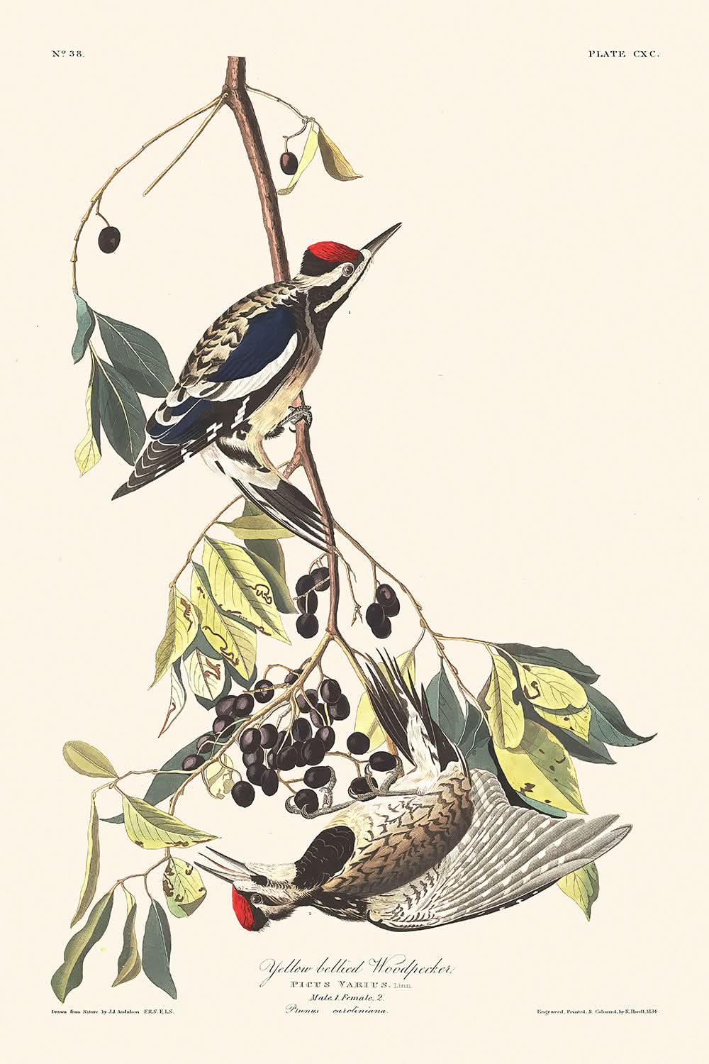 John James Audubon, célebre por sus representaciones intrincadas y realistas de la vida salvaje estadounidense, ha capturado la esencia del pájaro carpintero de vientre amarillo (Picus varius) con una precisión y una atención al detalle notables. Las obras de Audubon, especialmente las incluidas en The Birds of America, se consideran una de las mejores contribuciones ornitológicas al campo, y solo quedan unas pocas copias originales en bibliotecas e instituciones prestigiosas de todo el mundo.