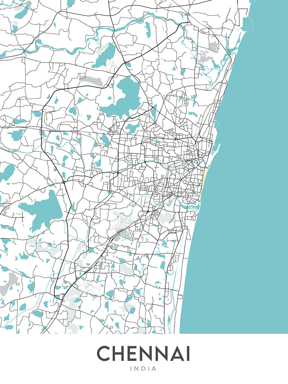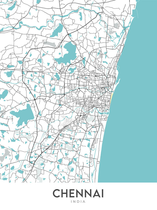 Plongez-vous dans la métropole animée de Chennai avec cette superbe carte de The Unique Maps Co. Cette carte routière moderne et méticuleusement détaillée offre une nouvelle perspective sur l'une des villes les plus animées de l'Inde. Avec ses lignes épurées et l'absence d'étiquettes, la carte vous invite à explorer le réseau complexe de rues qui traversent les divers quartiers de Chennai. Du centre culturel de Mylapore au dynamisme commercial de T. Nagar, et du bord de mer serein de Besant Nagar aux enclaves huppées d'Anna Nagar, cette carte capture l'essence du paysage urbain varié de Chennai.