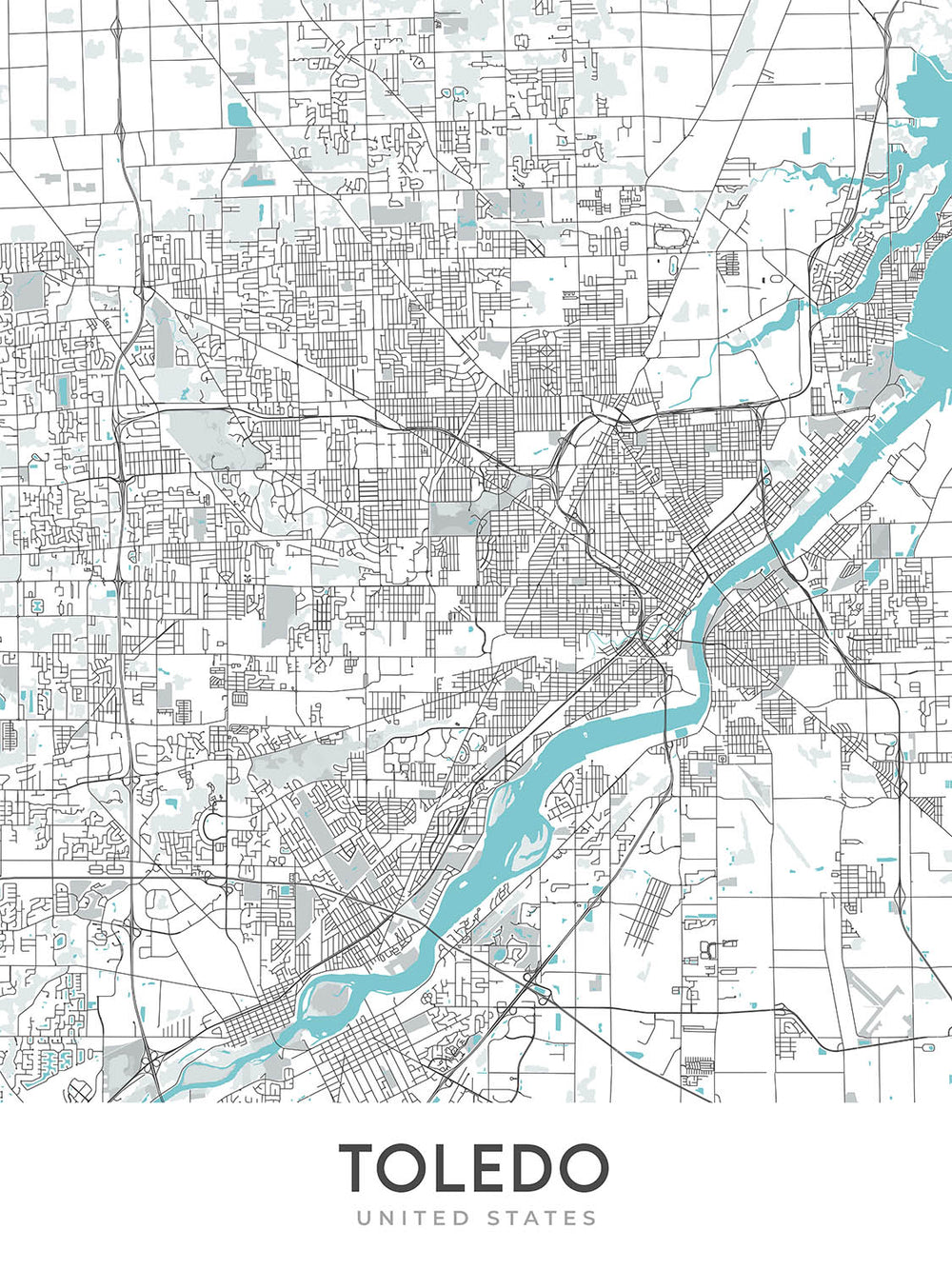 Plan de la ville moderne de Toledo, OH : centre-ville, musée d'art de Toledo, I-75, I-80/90, Université de Toledo