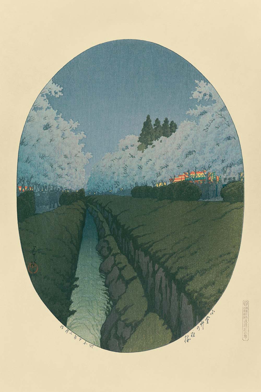 Vue nocturne des cerisiers en fleurs à Koganei par Hasui Kawase 1935