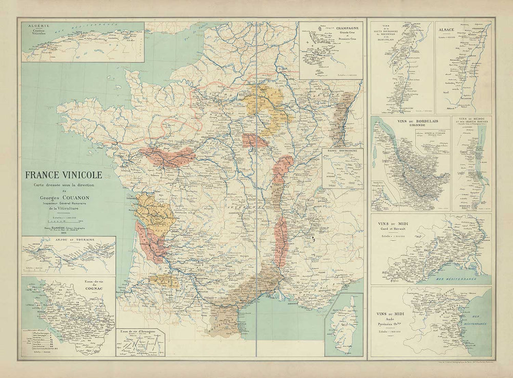 Ancienne carte des régions viticoles françaises, 1924: Bordeaux, Rhône, Champagne, Bourgogne, Alsace, Cognac