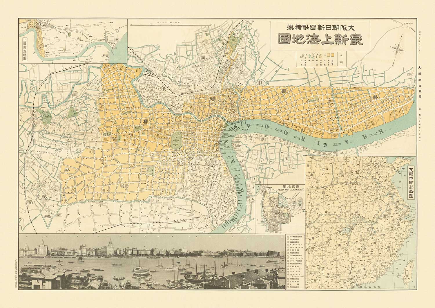 Cette magnifique carte ancienne de Shanghai a été publiée en 1935. Elle a été créée par le Osaka Daily News.