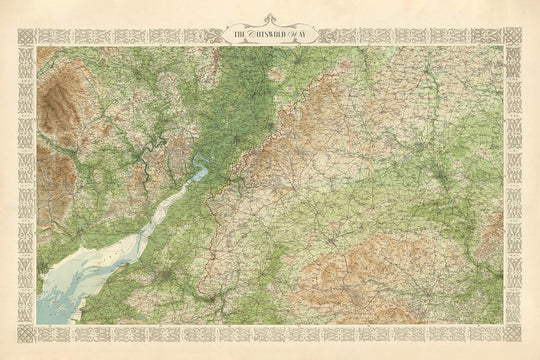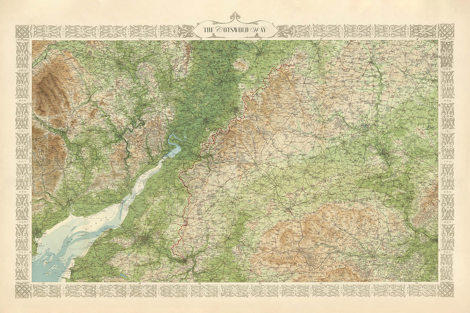 Cette carte illustre magnifiquement les paysages diversifiés des Cotswolds, des collines ondulantes aux bois luxuriants. Le parcours est marqué par une ligne rouge en pointillés, guidant le spectateur à travers des villes pittoresques et une campagne vibrante. La topographie détaillée, héritée de la carte de 1901, met en valeur les caractéristiques naturelles de la région, y compris le majestueux fleuve Severn et les forêts verdoyantes qui définissent la zone. Chaque élément est rendu avec soin, offrant un portrait vivant de ce paysage anglais emblématique.