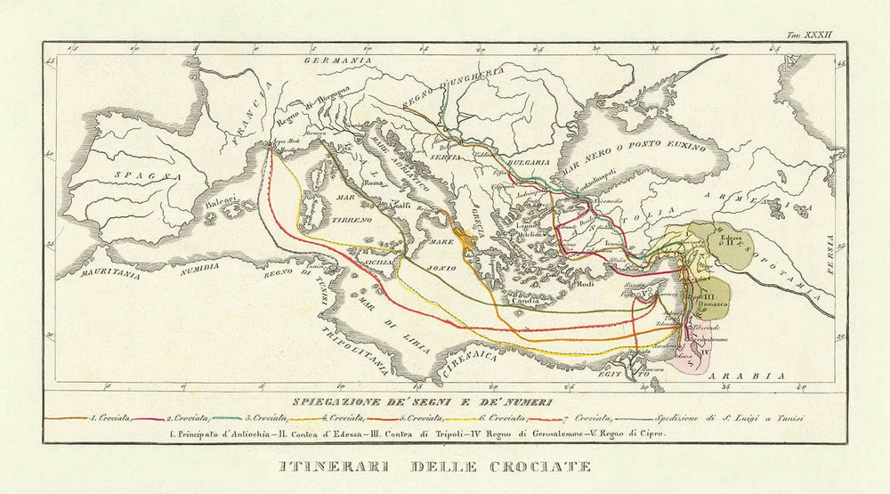 L'Itinerari delle Crociate n'est pas seulement une représentation géographique, mais un récit d'ambition, de foi et de conflit. Il délimite les territoires et les principautés qui ont joué un rôle crucial pendant les croisades, comme la principauté d'Antioche et le royaume de Jérusalem. Ces régions, marquées avec précision, reflètent les alliances changeantes et la dynamique du pouvoir qui ont caractérisé le Moyen-Orient médiéval. La carte retrace également l'expédition de Saint-Louis en Tunisie, ajoutant une autre couche d'intrigue historique à cet artefact déjà fascinant.