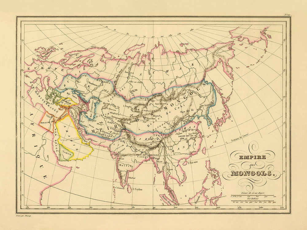La carte "Empire des Mongols" est un trésor d'informations historiques, présentant le paysage géopolitique à l'apogée du pouvoir mongol. Elle délimite les vastes territoires de l'Europe de l'Est à l'Asie de l'Est, y compris des régions significatives comme la Perse, l'Inde et la Chine, qui ont été profondément influencées par le règne mongol.
