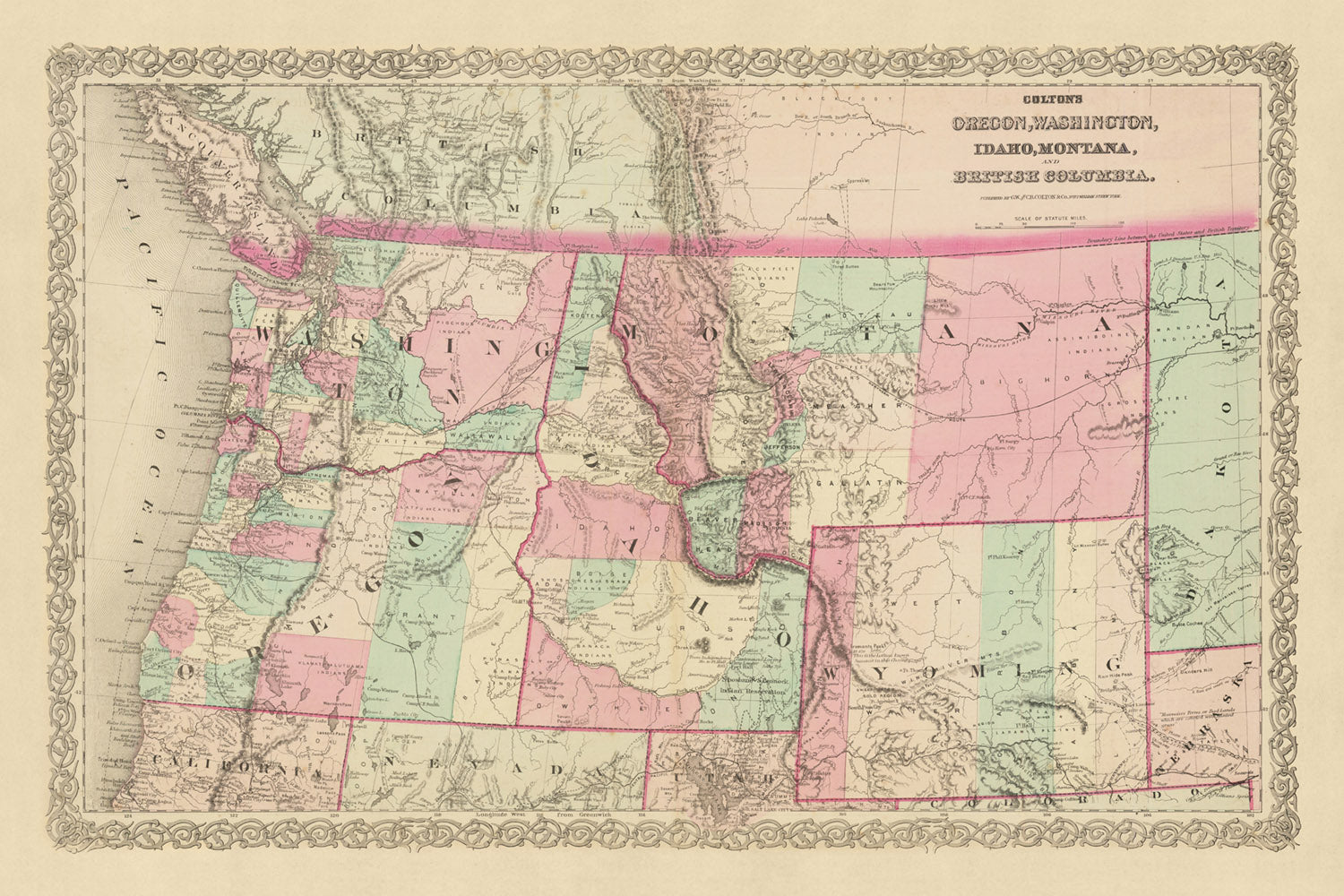 Ancienne carte du nord-ouest du Pacifique par JH Colton, 1868 : Portland, Seattle, Boise, Helena, Cheyenne