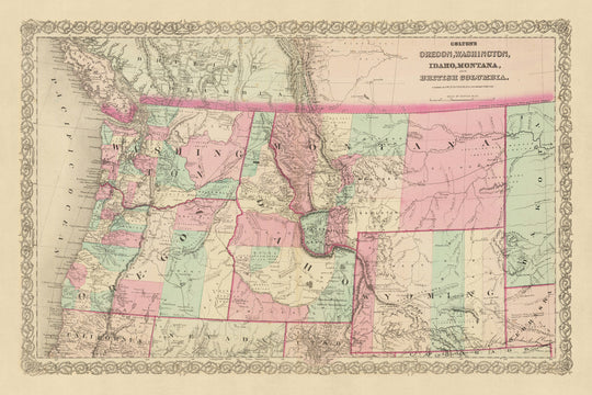 Cette carte, travail minutieux du célèbre JH Colton, offre un instantané éclairant du nord-ouest du Pacifique à cette période charnière. Colton, largement considéré comme le meilleur cartographe américain de son époque, possède une capacité inégalée à transmettre à la fois la précision géographique et l’air du temps de l’époque. Ses représentations ne sont pas de simples croquis mais des histoires d'une nation en plein essor, de son paysage et de son ambition.