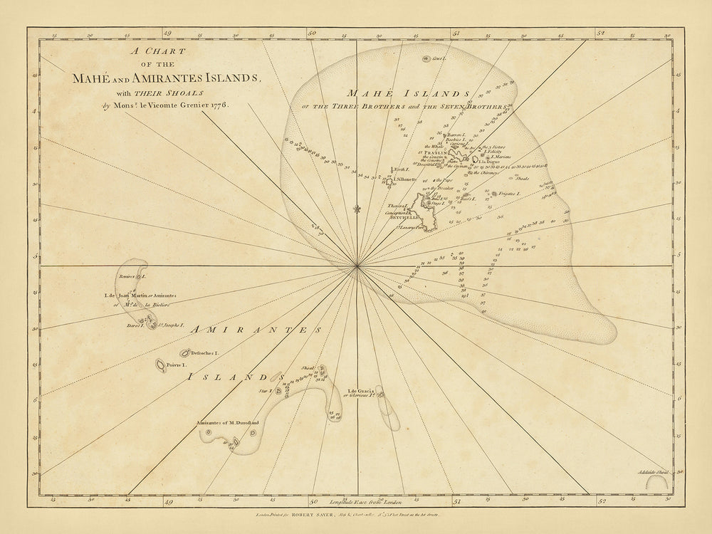 - 1776 : Robert Sayer publie « Une carte des îles Mahé et Amirantes, avec leurs hauts-fonds par Monsr. le Vicomte Grenier'