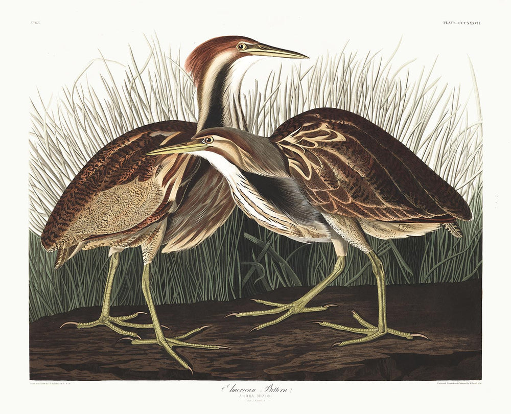 Les naturalistes observateurs noteront qu'il y a en fait un mâle et une femelle Butor américain dans cette illustration. Le mâle est à gauche, avec un plumage de tête plus proéminent. n'existe plus. À l'époque, Audubon a nommé cet oiseau ardea minor, mais il a depuis été reclassé en Botaurus lentiginosus. Cet oiseau de rivage se trouve presque exclusivement en Amérique du Nord ; il niche au Canada et au Groenland, et hiverne dans le Golfe du Mexique.