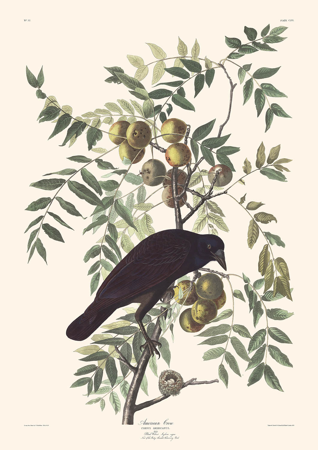 Le Corbeau américain (plaque 156), publié pour la première fois en 1827, est l'une des illustrations d'oiseaux intrigantes tirées de l'œuvre emblématique de John James Audubon, Les Oiseaux d'Amérique. Connu pour son souci du détail et sa représentation réaliste, Audubon donne vie au majestueux mais souvent mal compris Corbeau américain.
