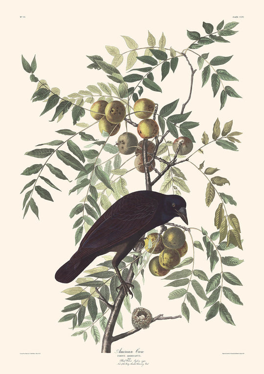Cette belle impression met en valeur l'habileté d'Audubon dans l'utilisation de la couleur et de la composition. Le corbeau, avec ses plumes noires brillantes teintées de reflets bleu-violet, est mis en valeur par le délicat feuillage vert en arrière-plan, créant un équilibre harmonieux. Les détails complexes capturent la texture du plumage et le comportement vigilant mais prudent du corbeau, en faisant une pièce maîtresse pour n'importe quelle pièce.
