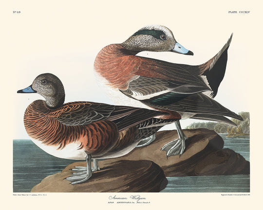"American Widgeon" se distingue par sa représentation vibrante de ce beau canard, avec ses motifs ondulants et sa représentation réaliste des oiseaux mâles et femelles. L'utilisation de motifs de plumes détaillés et la représentation à taille réelle améliorent la qualité réaliste de l'œuvre. Les couleurs et la position dynamique des canards font de cette illustration non seulement un exploit artistique mais aussi une pièce cruciale pour les passionnés d'histoire naturelle.