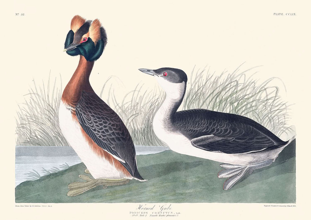 John James Audubon, un ornithologue et artiste notable, est renommé pour son projet ambitieux, Les Oiseaux d'Amérique. Cette série, composée de 435 aquarelles à taille réelle d'oiseaux nord-américains, est considérée comme une contribution monumentale à l'ornithologie et à l'art. Le Grèbe à cou noir est un témoignage de la capacité d'Audubon à allier précision scientifique et grâce artistique.