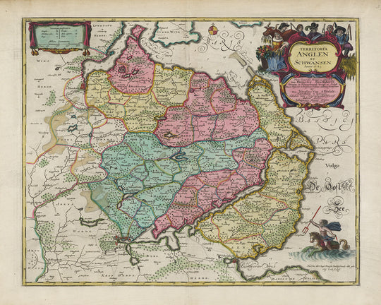 Ancienne carte de l'Anglia et du Schwansen par Joan Blaeu, 1665: Flensburg, Schleswig, Glücksburg, Kappeln, Süderbrarup, mer Baltique, fjords