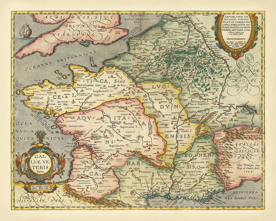 La carte détaille méticuleusement les régions de la France ancienne, s'étendant de la frontière avec l'Espagne (Hispaniae pars) au sud-ouest jusqu'à la Grande-Bretagne (Britanniae pars) au nord-ouest, et vers l'est jusqu'à l'Allemagne (Germaniae Magnae pars) et l'Italie (Italiae Gallicae pars). Le pays est divisé en quatre provinces principales : Belgica, Celtica Lugdunensis, Narbonensis et Aquitanica. Chaque province est riche en signification historique, montrant l'influence de l'Empire romain et le réseau complexe de villes et de bourgades qui ont prospéré sous son règne.