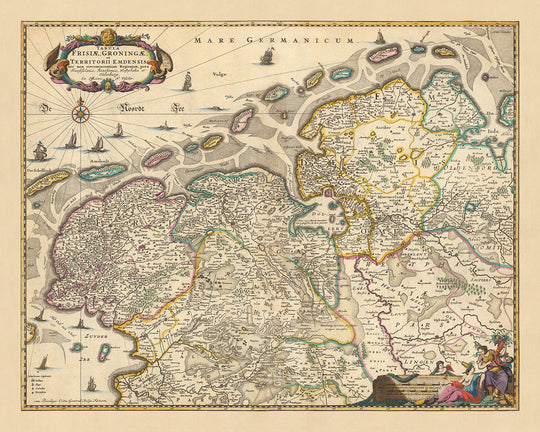Le nom complet de la carte, « Tabula Frisiae, Groningae, et Territorii Emdensis nec non circumjacentium Regionum, puta Transisalaniae, Benthemiae, Westphalae et Oldenburgi », se traduit par « Carte de la Frise, de Groningen et du territoire d'Emden, ainsi que le régions environnantes, à savoir la Transisalanie, Bentheim, la Westphalie et Oldenbourg ». Cette vaste couverture offre une vue complète du nord des Pays-Bas et du nord-ouest de l'Allemagne à la fin du XVIIe siècle.