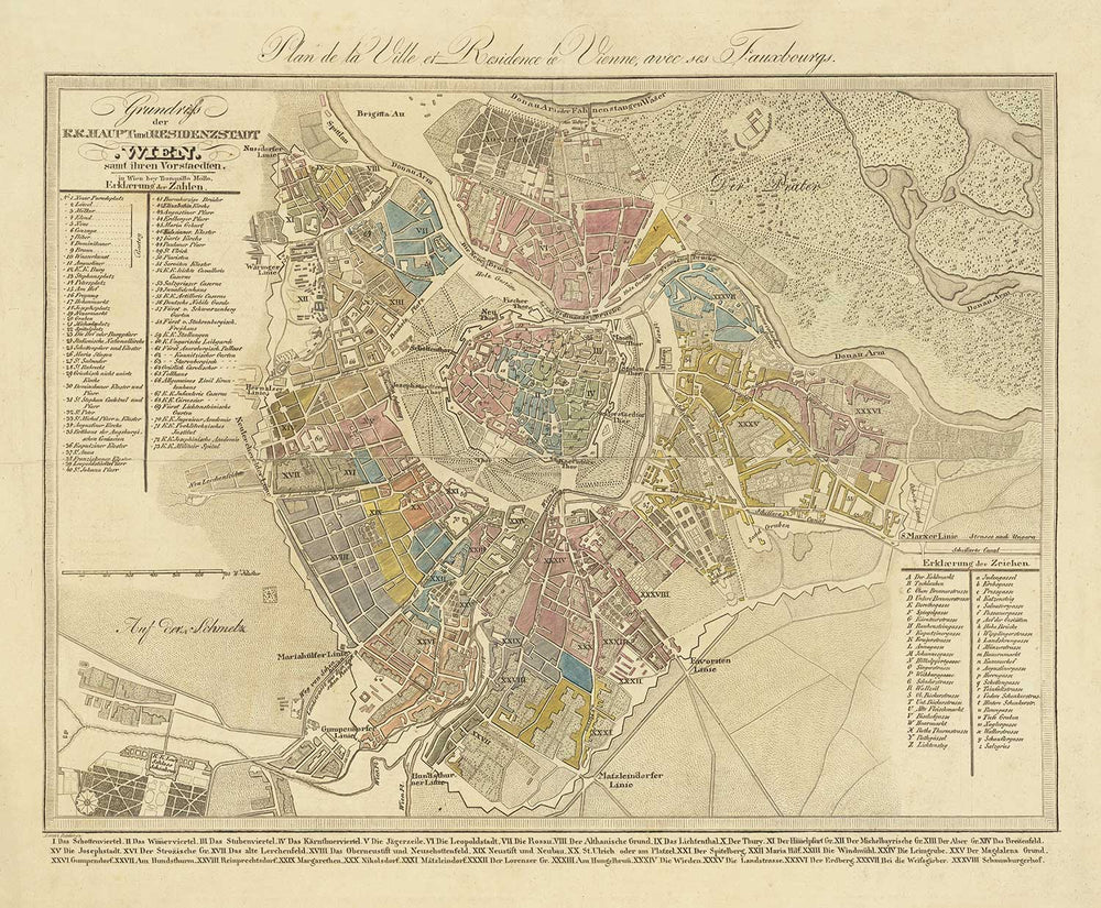 Ancienne carte de Vienne par Tranquillo Mollo en 1803: Augarten, Praterstern, Franzensbrucke, Burggarten, City Park