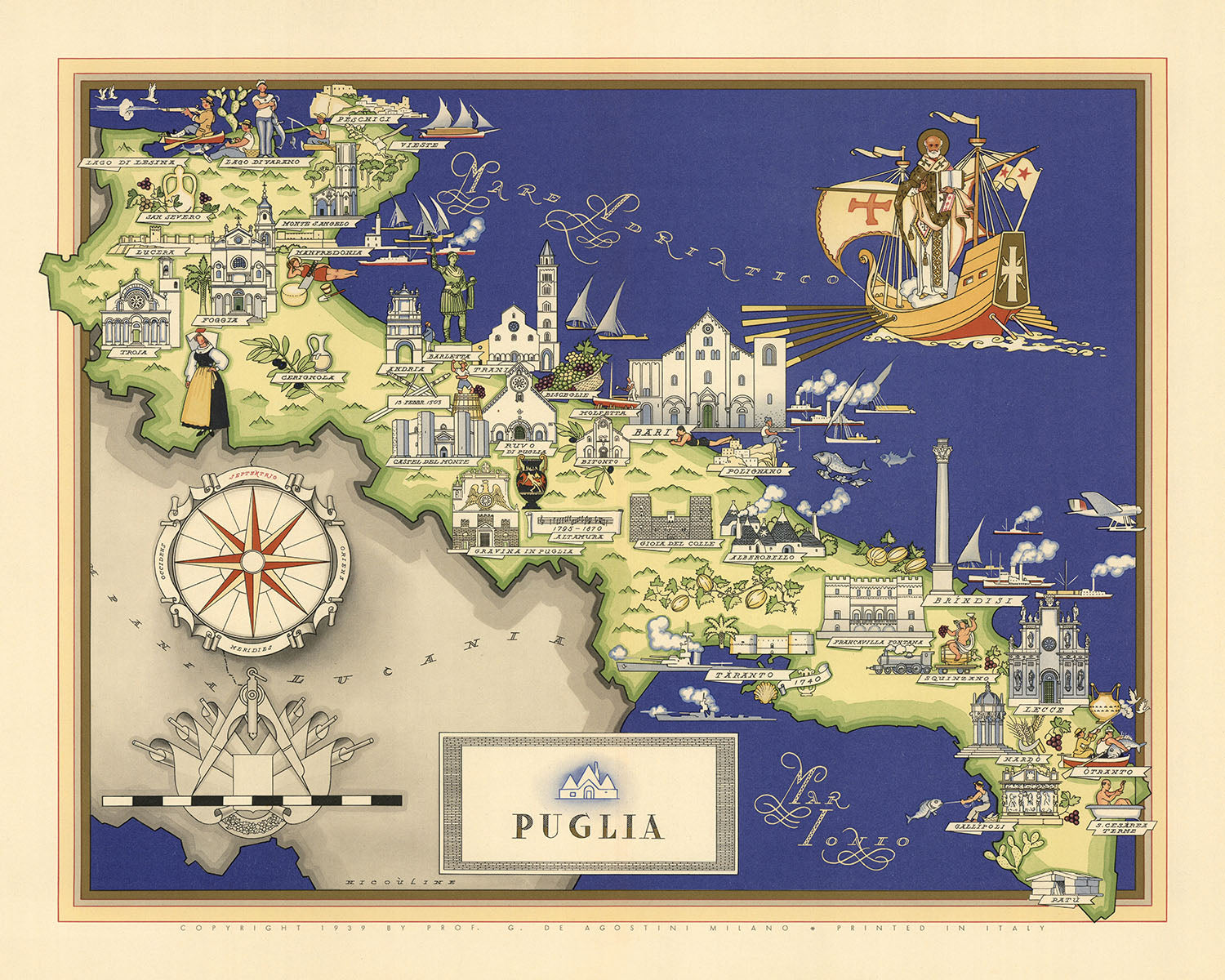 Ancienne carte picturale des Pouilles par De Agostini, 1938 : Bari, Brindisi, Foggia, Lecce, Tarente