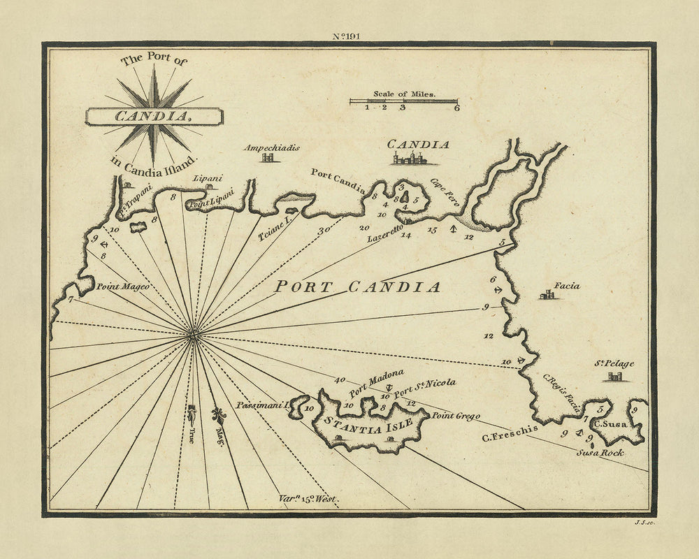 La carte de Candie réalisée par Heather se distingue par l'attention méticuleuse portée à la délimitation des lignes côtières, des ports et des points de repère maritimes. Les villes de Candia, Suda et Facia sont clairement indiquées, fournissant non seulement un outil de navigation mais aussi un instantané des centres urbains de la Crète du début du XIXe siècle. Les baies de Candie et de Sude, ainsi que le cap de Spada, sont représentés avec précision et servent de points de référence cruciaux pour les marins. Ce niveau de détail témoigne des progrès des techniques de gravure anglaises, notamment exécutées par John Stephenson, dont le monogramme orne cette carte.
