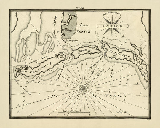 La carte de Heather est un témoignage des avancées en cartographie nautique de son époque. Elle est richement ornée de sondages, de mouillages et d'un plan méticuleux du village, offrant une vue complète de la région côtière. Notamment, la carte inclut les emplacements de Malamocco, du Lido et de l'Arsenal de Venise, chacun significatif pour leur rôle dans l'histoire maritime et militaire. L'inclusion de la rivière Piave et du golfe de Venise complète encore plus le détail étendu de la carte, en faisant une ressource indispensable pour comprendre la géographie et l'importance navale de Venise.
