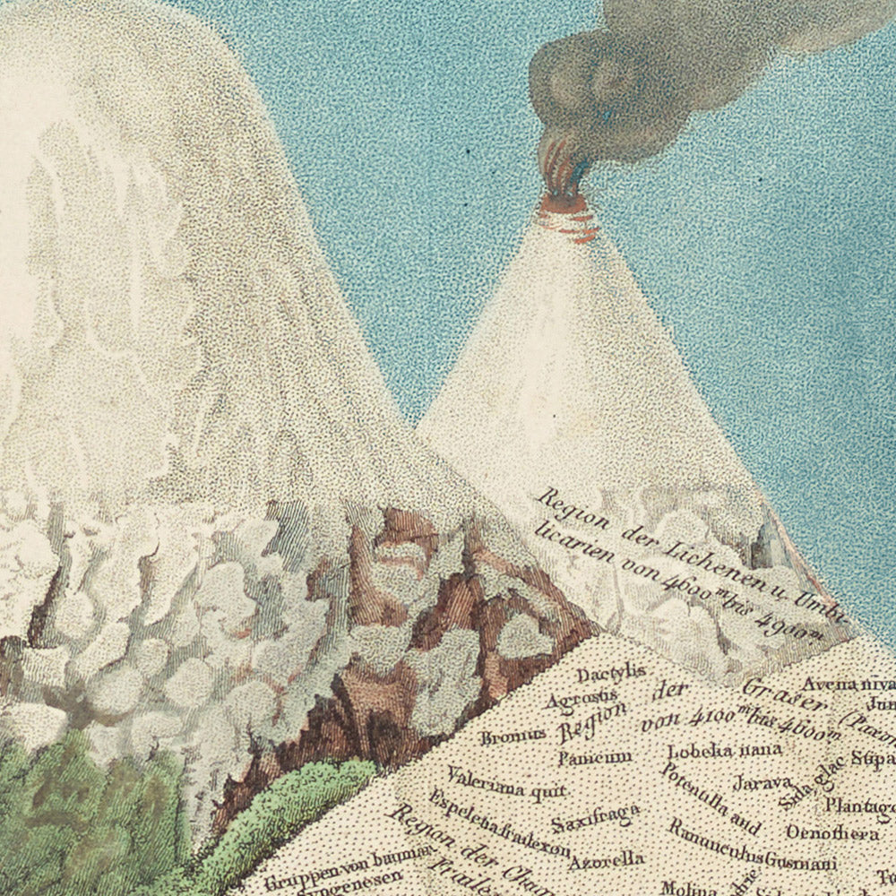 Chimborazo Volcano by Alexander von Humboldt is a landmark work of early nineteenth-century science and art, first published in 1807. Created after Humboldt’s celebrated expedition through the Andes, this antique colour lithograph distills an audacious idea: that life on Earth arranges itself in bands with altitude and climate. The image presents the Andean giant as a crisp profile, its snow-bright summit tapering into a triangulated silhouette, while an intricate weave of fine typography maps plant life up the mountain’s flanks. The result is both a lyrical portrait of Chimborazo and a revolutionary “portrait of nature” that helped establish the field of biogeography.