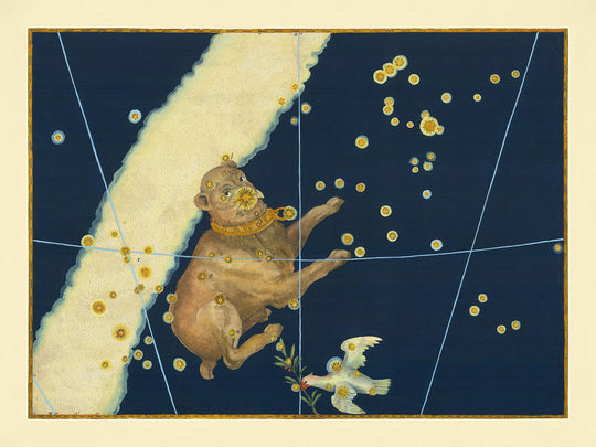 La carte de la constellation de Canis Major est un exemple parfait de l'art et de la précision de Bayer. La coloration à la main et les détails dorés rehaussent la valeur esthétique, en faisant non seulement un outil scientifique mais aussi une œuvre d'art. La grille du tableau, basée sur les positions des étoiles de Tycho Brahe, permet des lectures précises qui étaient incroyablement avancées pour son époque. Le travail de Bayer se distingue par son mélange d'exactitude scientifique et de beauté artistique, faisant de cette impression un incontournable pour les passionnés d'astronomie et d'art historique.