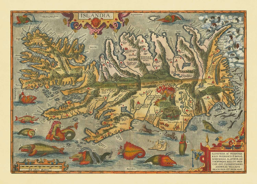 Rare ancienne carte d'Islande par Ortelius, 1603: Reykjavik, Keflavik, Volcans, Montagnes, Fjords, Glaciers, Monstres de la mer