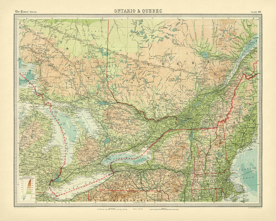 Ancienne carte de l'Ontario et du Québec par Bartholomew, 1922 Toronto, Montréal, fleuve Saint-Laurent, Grands Lacs