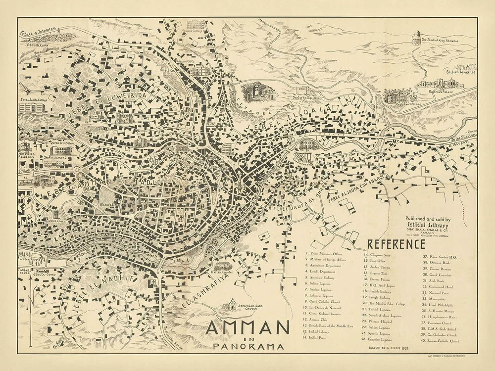 « Amman in Panorama », réalisée par l'artiste russo-palestinien George Aleeff en 1952, est une représentation captivante d'Amman pendant ses années de transformation en tant que capitale de la Jordanie. Cette carte n'est pas seulement une représentation géographique, mais un récit vivant d'une ville à l'aube de la modernité. Avec son esthétique moderne du milieu du siècle, la carte capture l'essence d'une métropole en plein essor, mettant en valeur la mosaïque complexe des rues et des quartiers d'Amman. Elle témoigne de l'évolution dynamique de la ville et de la nouvelle indépendance de la Jordanie.