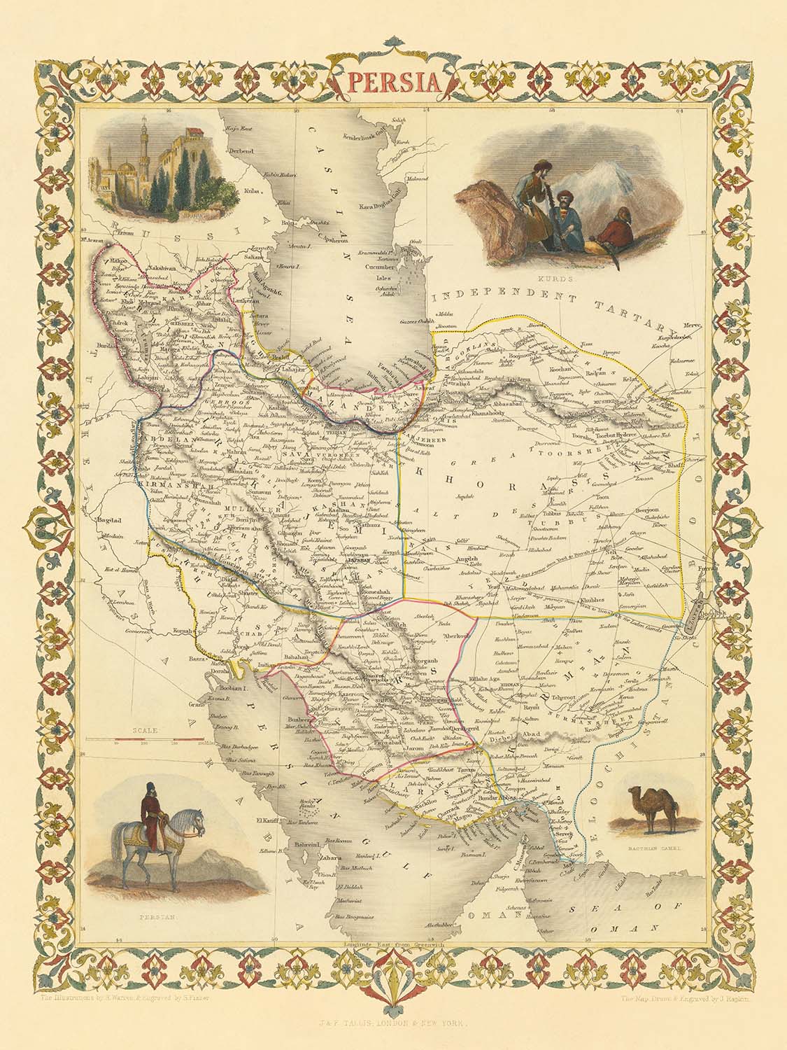 Une caractéristique de l'art de Tallis est l'inclusion de vignettes évocatrices, et « Perse » ravit avec ses illustrations décoratives. Celles-ci incluent une vue panoramique d'Ispahan (Isfahan moderne), la ville resplendissante qui a autrefois servi de capitale de l'Empire safavide ; un groupe de Kurdes en tenue traditionnelle, reflétant la diversité ethnique de la région ; un majestueux chameau bactrien, emblématique des caravanes de la Route de la Soie ; et un cavalier persan, capturant les traditions équestres profondément ancrées dans l'identité persane. Ces scènes offrent un rare aperçu de la vie quotidienne et de la vitalité culturelle de la Perse du 19ème siècle.