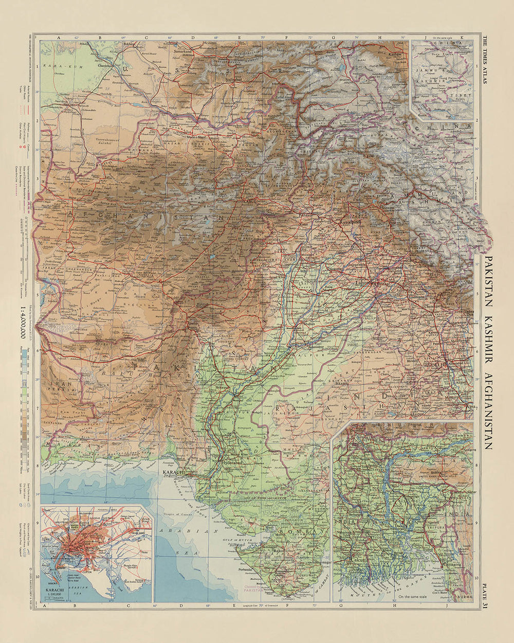 Ancienne carte du Cachemire, du Pakistan et de l'Afghanistan par Bartholomew, 1959 : Karachi, fleuve Indus, Hindu Kush, Kaboul, Lahore