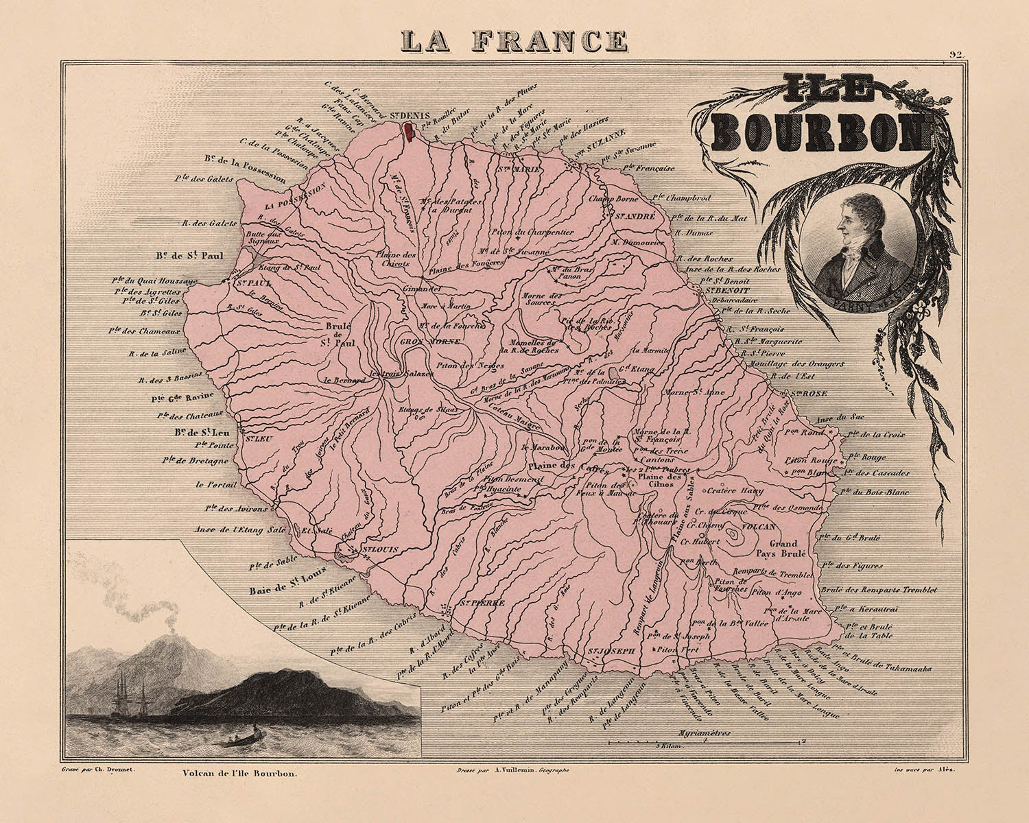 Ancienne carte de l'île de la Réunion par Vuillemin, 1869: Volcan, Saint-Denis, Saint-Pierre, Océan Indien, Canne à sucre