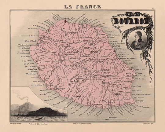 Géographiquement, la carte présente l'île de la Réunion dans toute sa splendeur dramatique. Le terrain volcanique accidenté est rendu de manière indiscutable, avec le volcan central de l'île (« Volcan ») se tenant comme un repère naturel dominant. L'océan Indien environnant est gracieusement dépeint, soulignant la position éloignée mais stratégique de l'île. Les limites administratives sont tracées avec précision, fournissant un aperçu de la gouvernance coloniale de l'époque, tandis que l'intérieur montagneux et les régions côtières luxuriantes prennent vie grâce à la main habile de Vuillemin. Cette attention minutieuse à la topographie et à l'utilisation des terres offre une rare fenêtre sur le paysage environnemental et politique de l'époque.