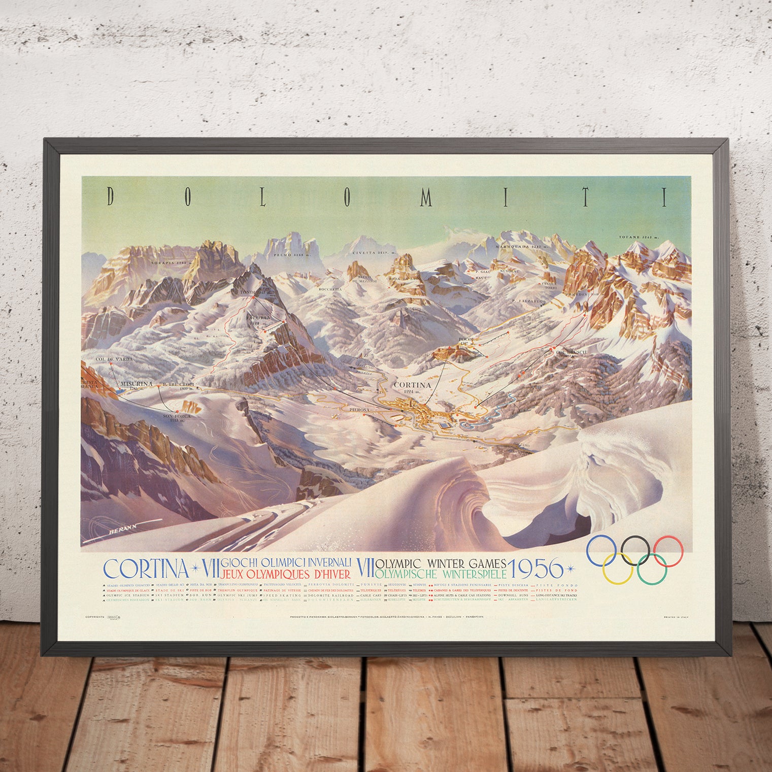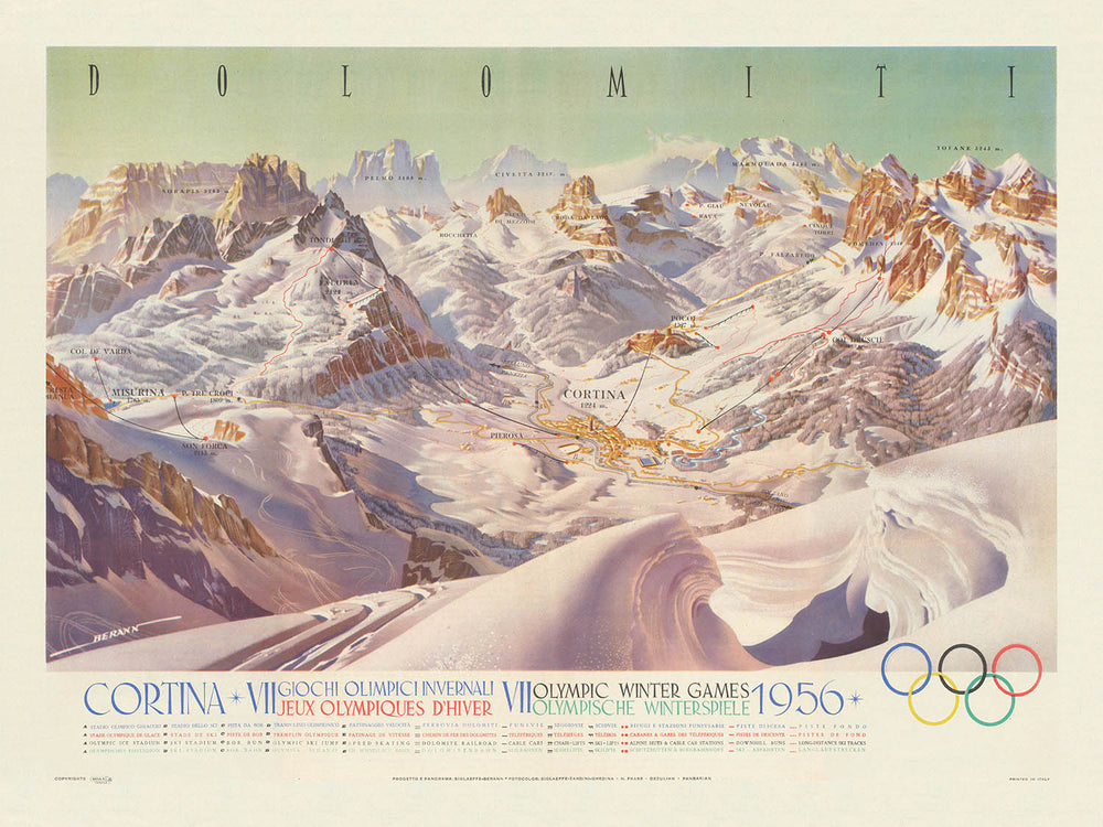 As a historical document, the map freezes a transformative winter. The VII Olympic Winter Games were among the first to be televised across Europe, projecting Cortina’s luminous scenery to a new mass audience and cementing Italy’s postwar renaissance in the Alps. The Soviet Union made its Winter Olympics debut here, reshaping competitive narratives and heralding a new era in sport. Berann’s multilingual labels speak to the Games’ internationalism, while the Olympic rings punctuate the sheet with quiet authority. Together, these elements preserve a precise cultural moment: mid-century Cortina as both glamorous resort and global arena, where the Dolomites became a shared visual language for sport, travel, and aspiration.