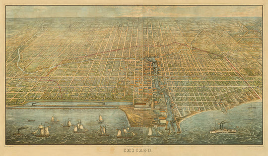 L'art de la carte est égalé par sa signification cartographique. La perspective aérienne de Palmatary, rendue avec un soin minutieux, offre un sens immersif du lieu - un qui met en évidence le quadrillage des rues de la ville, le fleuve Chicago sinueux et l'immense étendue du lac Michigan. Des navires naviguent sur les eaux, et les voies ferrées nouvellement achevées serpentent à travers le paysage urbain, témoignant du rôle de Chicago en tant que carrefour du commerce et de la migration. Chaque bâtiment, bloc et boulevard est dessiné avec un souci à la fois d'exactitude et de drame, invitant collectionneurs et historiens à retracer l'ascension rapide de la ville.