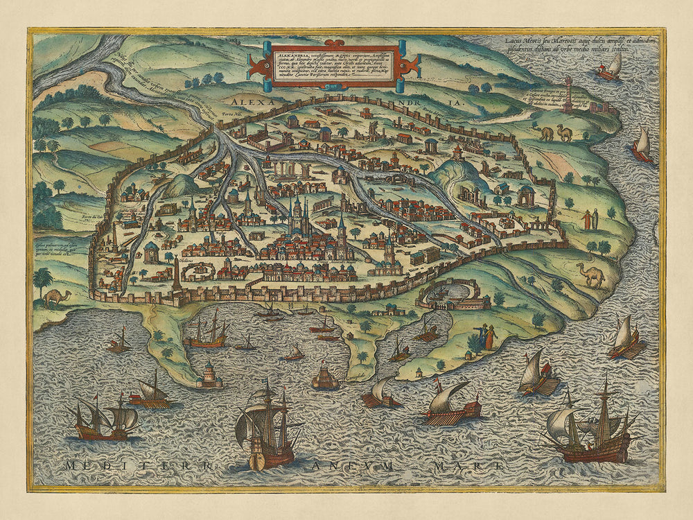 En explorant la carte, vous remarquerez les voies navigables méticuleusement dessinées qui traversent la ville, reflétant le lien vital d'Alexandrie avec la mer Méditerranée. La présence de navires dans le port souligne encore le rôle de la ville en tant que centre commercial majeur dans le monde antique. Les illustrations environnantes de chameaux et d'autres personnages offrent un aperçu de la vie quotidienne et de la culture dynamique des habitants de la ville.