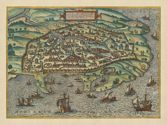 Ancienne carte Birdseye d'Alexandrie, Égypte par Braun, 1575: Pillier de Pompée, Tours, Remparts, Bateaux, Voies navigables