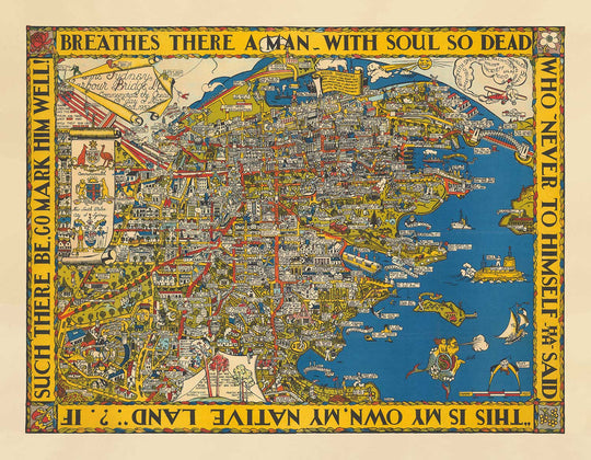 Ancienne carte pictoriale de Sydney, 1932 par Russell Lloyd: Harbour Bridge, Baies, Gare centrale, Jardins botaniques et sirènes!