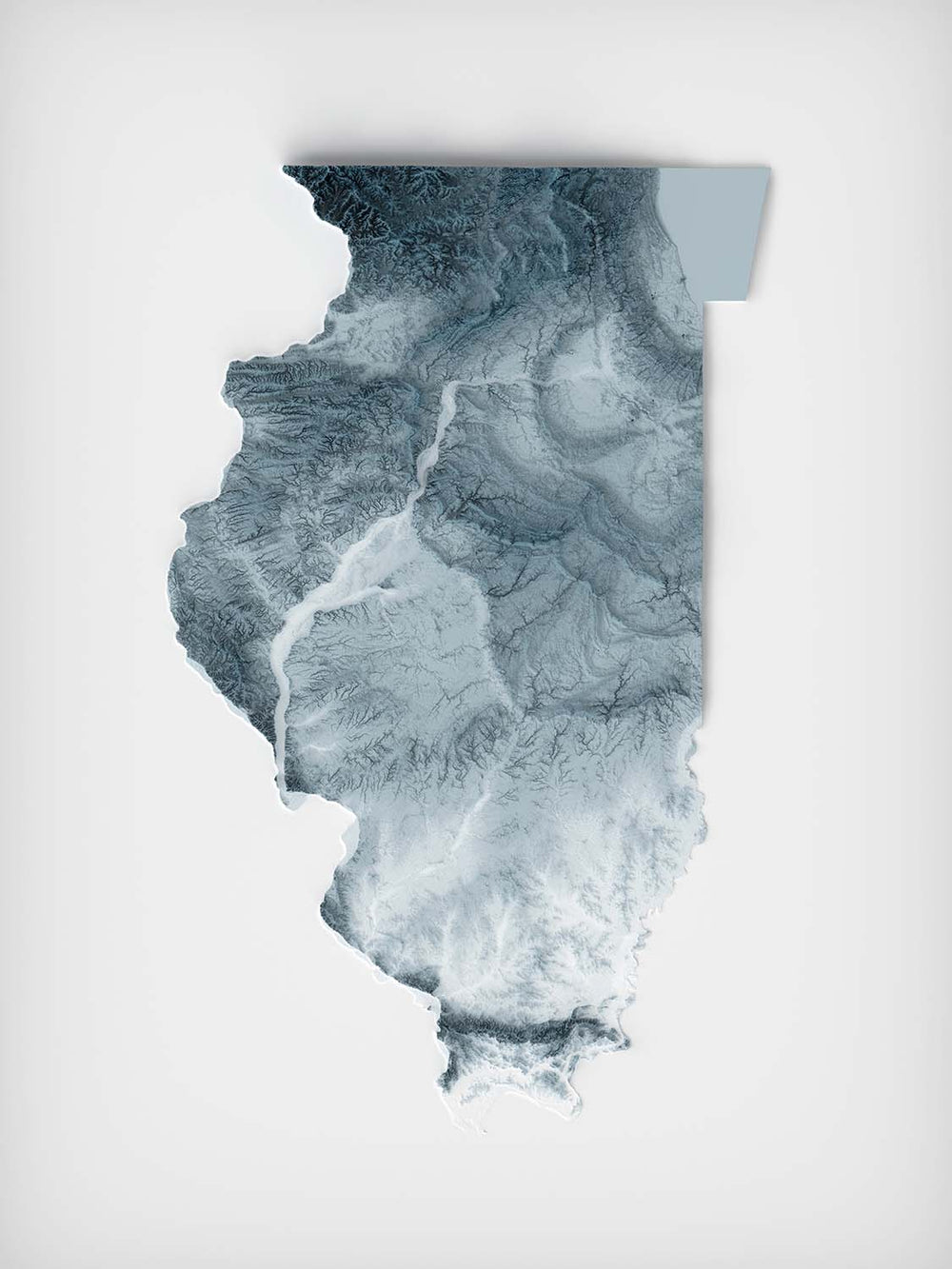 Des basses terres fertiles du fleuve Mississippi à l'ouest — où la terre s'étend large et plate — aux falaises surplombant les rivières Illinois et Ohio, chaque caractéristique est soigneusement rendue pour mettre en valeur la topographie distinctive de l'État des Prairies. Remarquez les contours légèrement surélevés traçant les anciennes moraines laissées par les glaciers en retrait, les douces crêtes ondulant à travers le nord-est, et les collines légèrement élevées de Shawnee dans le sud — l'une des caractéristiques naturelles les plus frappantes de l'Illinois.