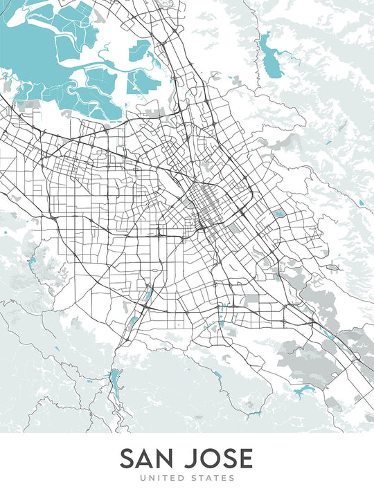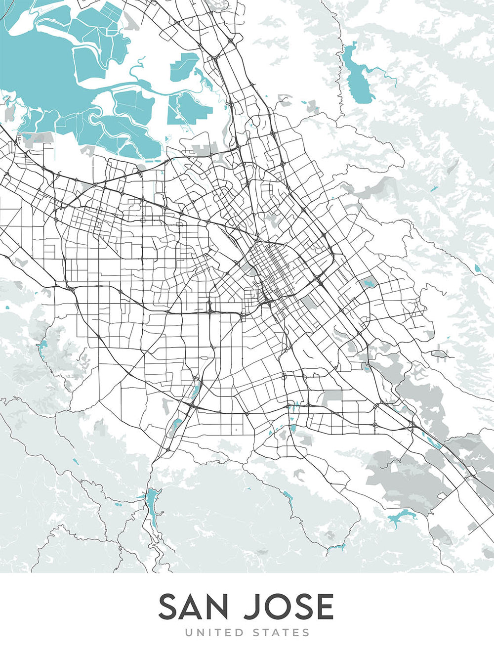 Cette carte de San Jose en Californie est un plan de rue moderne et détaillé sans étiquettes. Il se concentre sur la ville de San José et ses environs, offrant une représentation précise et visuellement attrayante de la région. La carte couvre une partie importante de la ville, y compris les quartiers populaires, les routes principales et les monuments remarquables.